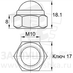 Гайка М10 глухая колпачковая шестигранная, со стопорным кольцом. Изготовлена из нержавеющей стали. Стандарт DIN986.