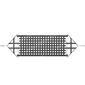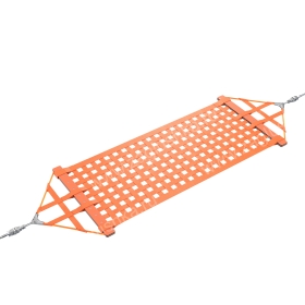 Полотно гамака выполнено из сшитых силовых строп (ременной ленты) шириной 50 мм и 70 мм. Полотно крепится к перекладинам из HPL. Подвесы состоят из ременной ленты, армированного каната диаметром 16 мм (арт. TA8-0160-001), специального крепления (арт. UG90), нержавеющей цепи (арт. ЦП766-6SА2), крепежа с резьбой шпилькой М16х200 мм для фиксации к опорным стойкам (арт. 1701D).