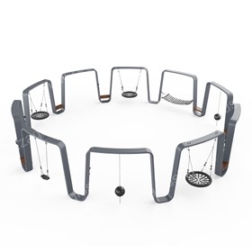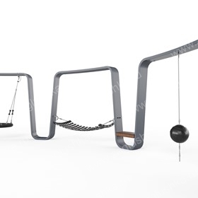 В конструкции используются качели Forto без спинки, «гнездо», сферические уступы и гамак. Подвесы к качелям Forto выполнены из нержавеющей цепи DIN766 6мм (арт. ЦП766-6SА2), для комфорта и безопасности во время раскачивания оснащены пластиковыми ручками (арт. РЧП6). Подвесы к качелям «гнездо» выполнены из армированного каната и оснащены ручками (арт. РЧП16КС). Дополнительно к подвесам крепится страховочная цепь (арт. СТРХ-250), обеспечивающая защиту от травмирования при обрыве основной цепи.