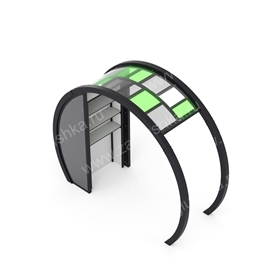 Конструкция представляет собой навес арочного типа, обшитый листами из поликарбоната. Внутри расположен стеллаж с полками для книг. Полки изготовлены из HPL, толщиной 15 мм.