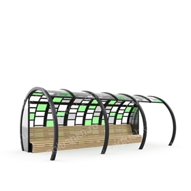 Конструкция представляет собой навес арочного типа, обшитый листами из поликарбоната. Внутри установлена скамейка со спинкой для отдыха. Скамейка выполнена из металлического каркаса и деревянных реек.
